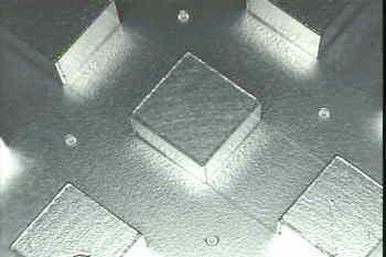 処理前に有ったバリやゴミ、小さなコンタミが無くなっています。素材はNi系で作られた微細精密形状加工製品で、高さ40ミクロン 幅20ミクロンの微細四角(■形状)柱が規則正しく形成されている。
